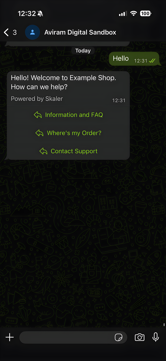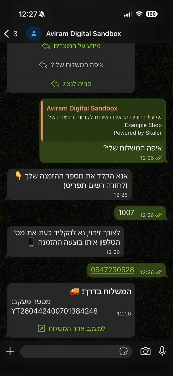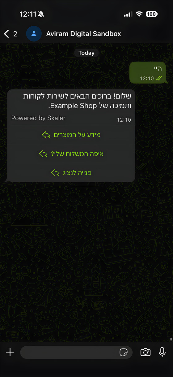 Skaler היא מערכת שירות לקוחות ושיווק בווטסאפ שעובדת על המספר העסקי שלך. היא עונה על שאלות, שולחת סטטוס הזמנה, ומעבירה לנציג אנושי רק כשבאמת צריך.